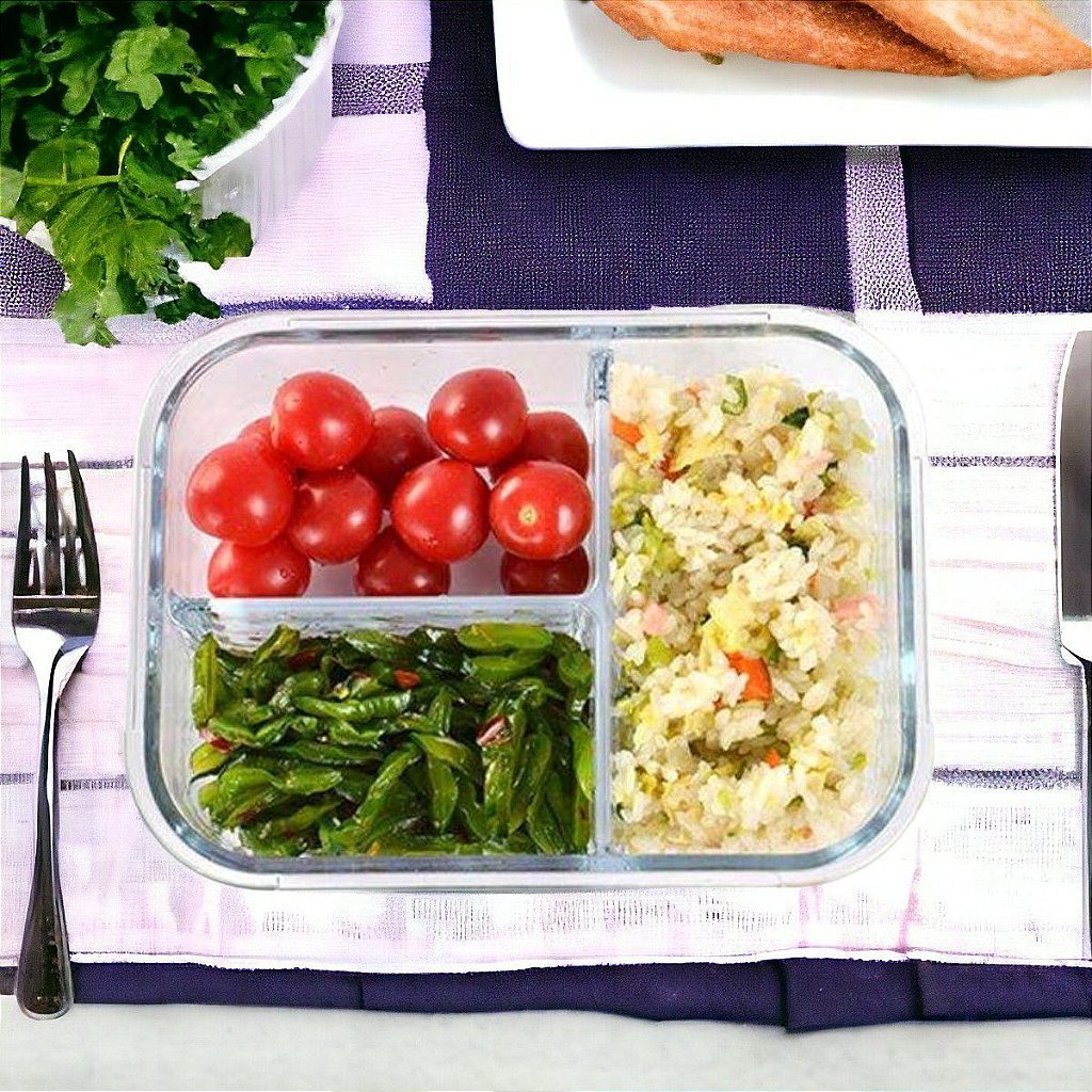 O Pote Hermético em Vidro com 3 Divisórias é ideal para armazenar uma variedade de alimentos, como frutas, verduras, legumes, saladas, sopas, refeições prontas, etc. É perfeito para quem quer organizar a geladeira e manter os alimentos frescos por mais tempo.